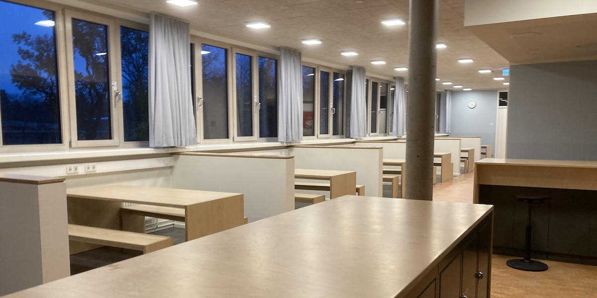 Als Weiterentwicklung des Clusters wurde ein Raumensemble geschaffen, das mehrere Instruktionsräume, Gruppenräume, Lehrerstützpunkt und eine große gemeinsam genutzte Fläche verbindet. Die Instruktionsräume sind in der Regel kleiner (z.B. nur 50m2) als normale Klassenräume und ‚gehören‘ auch nicht mehr einer Klasse, sondern die Nutzung muss im Team der Lehrkräfte abgesprochen werden. Die Schülerinnen und Schüler können sich in der gesamten Lernlandschaft frei bewegen und sich Arbeitsplätze suchen, das Mobiliar ist flexibel und kann einfach bewegt werden. Das Lernmaterial ist in der Lernlandschaft verfügbar, in der Regel sollte dies bereits digital sein. Die Instruktionsräume sind entweder mit Dreiecktischen oder mit einer Collegebestuhlung bestückt, interaktive Tafeln sind nicht notwendig, meist reichen frei hängende Beamer für die Projektion von Material oder Ergebnissen von Tablets aus. Sichtbeziehungen sind unbedingt notwendig, auf Türen zwischen den Räumen kann weitgehend verzichtet werden, Ausnahme ist hier der Teamstützpunkt und ggf. ein Gruppenraum. Realisiert ist dieses Konzept z.B. seit über 10 Jahren für die Klassen 5-10 im August-Ernst-Gymnasium in Oettingen, Bayern. Pädagogisch wird eine hohe Fähigkeit zur Selbstorganisation vorausgesetzt bzw. diese in den unteren Jahrgängen stark trainiert. Aber auch für einen Bildungsgang wie das Berufsvorbereitungsjahr (für Schüler nach 10jährigem Schulbesuch ohne Abschluss) ist ein solches Konzept erfolgreich realisiert worden, anzusehen in der Berufsschule 24 in Hamburg Eidelstedt.
